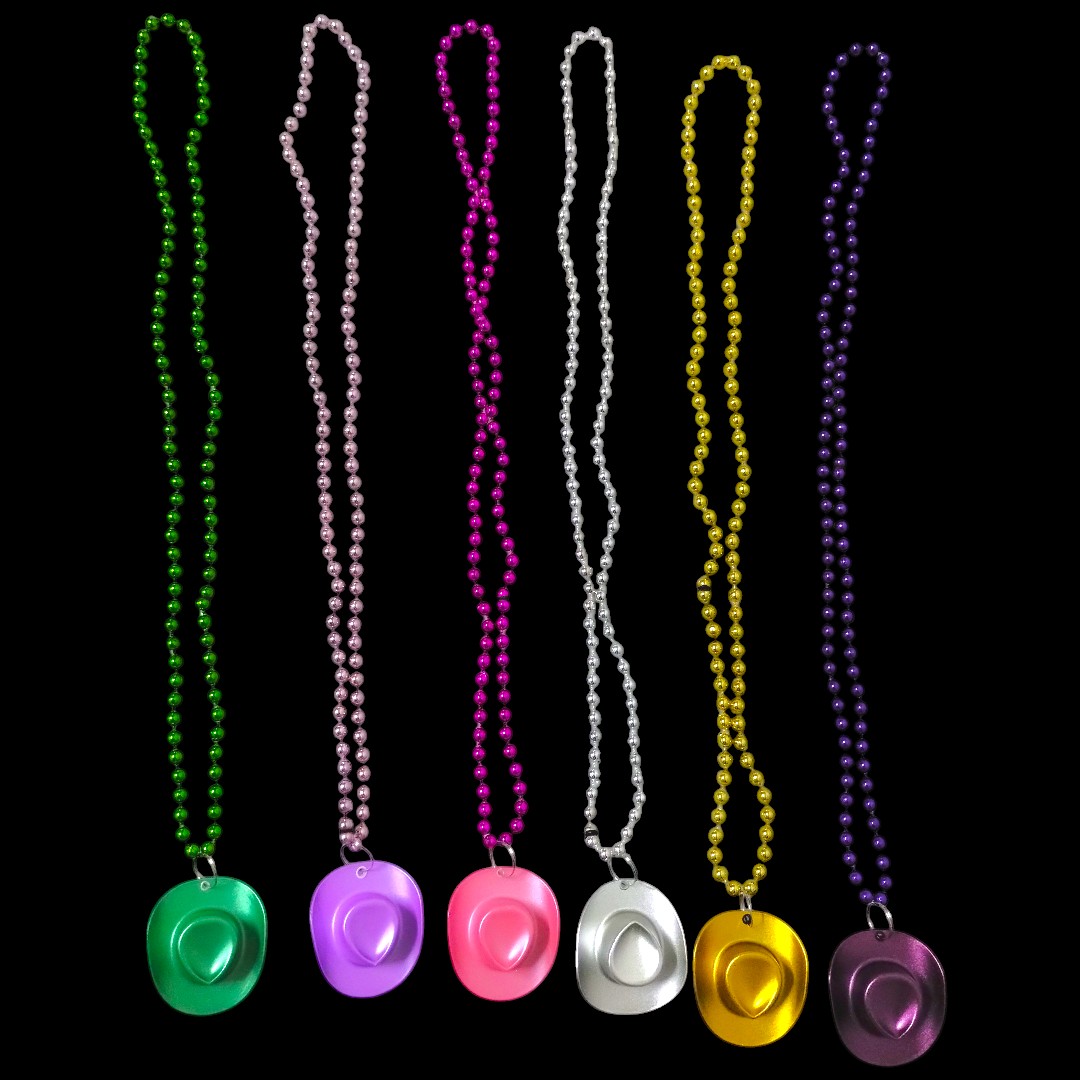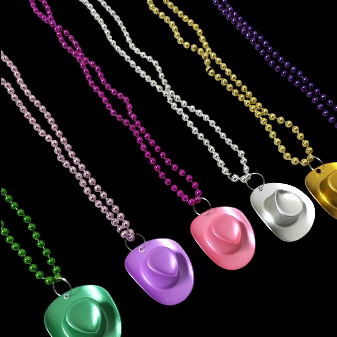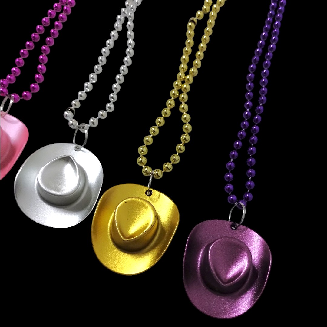 Estos llamativos collares cuentan con cadenas de bolitas metálicas en colores vibrantes y un dije en forma de sombrero cowboy que los hace únicos. Son ideales para fiestas temáticas, cumpleaños, eventos, cotillón o para completar looks divertidos y coloridos.
