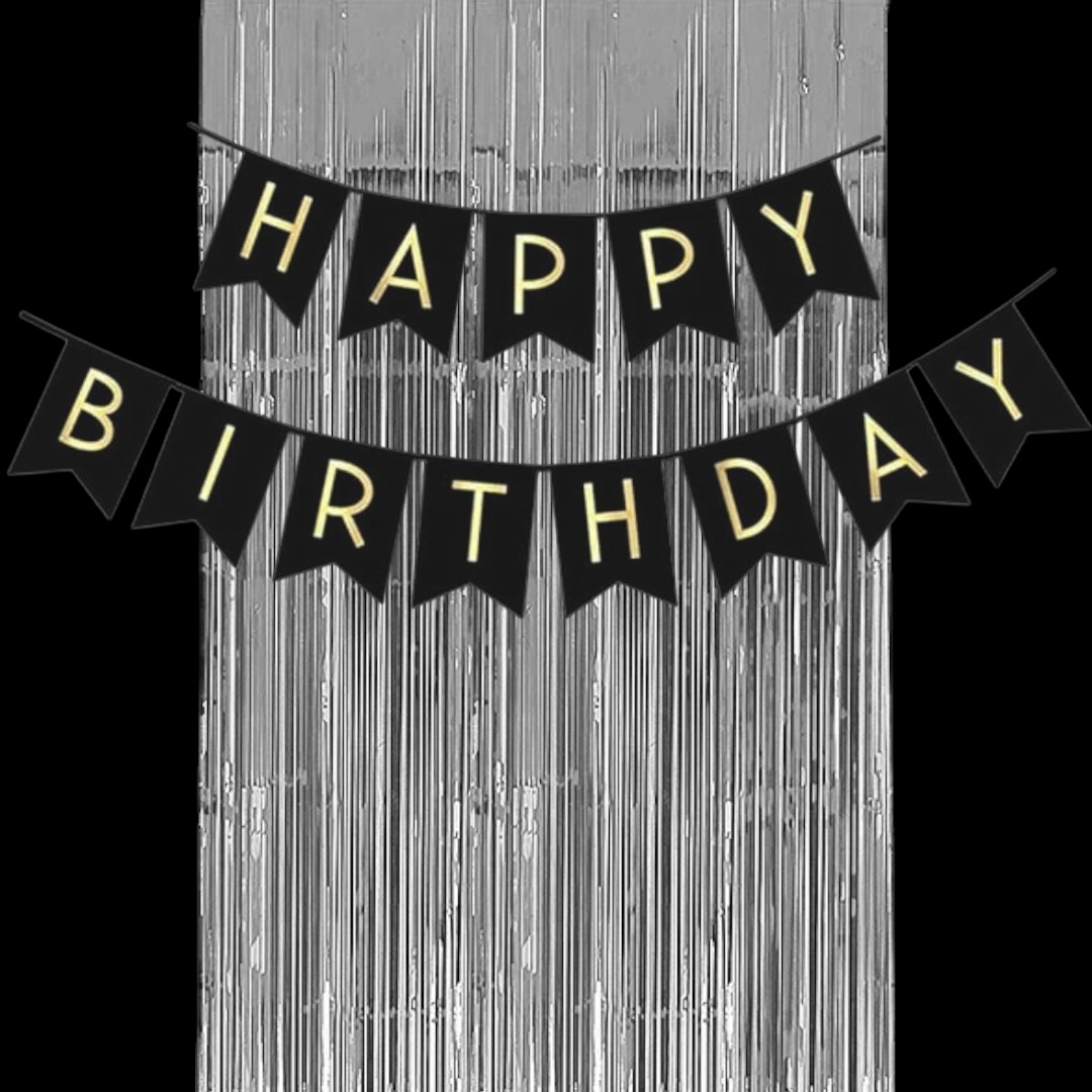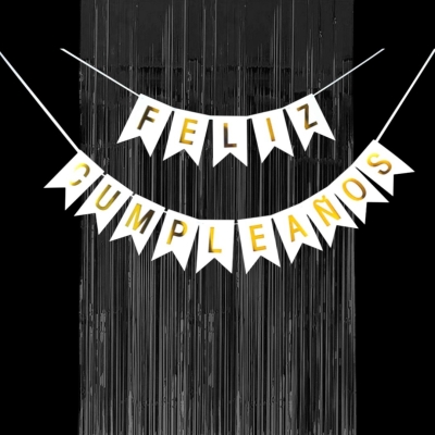 Banderín “Feliz cumpleaños” de cartón con cinta (negro, blanco, rosa pastel, rosa, celeste, celeste pastel )