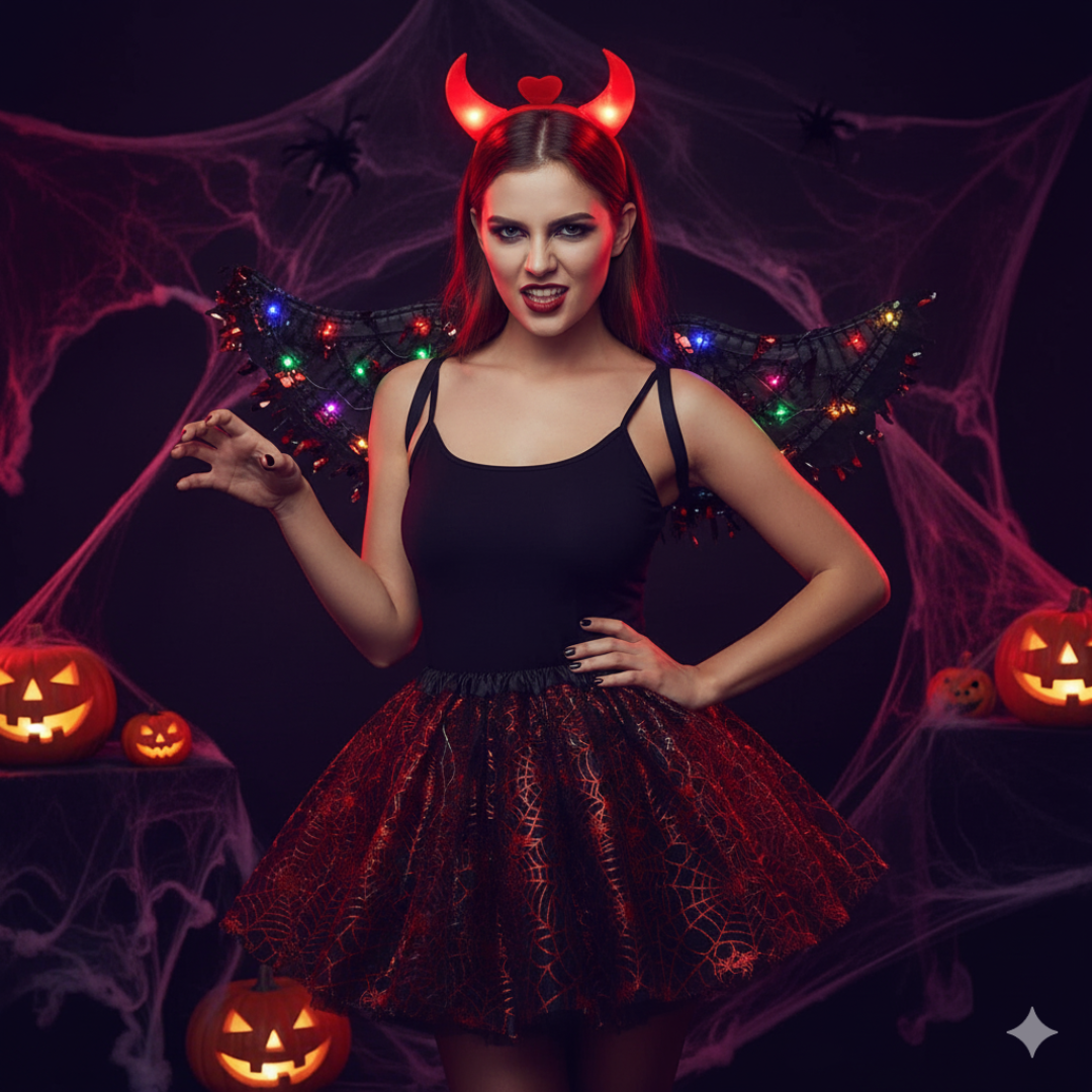 Un conjunto único y llamativo para brillar en cualquier fiesta temática o noche de Halloween. Perfecto para lograr un look diabólico con un toque luminoso y divertido.
