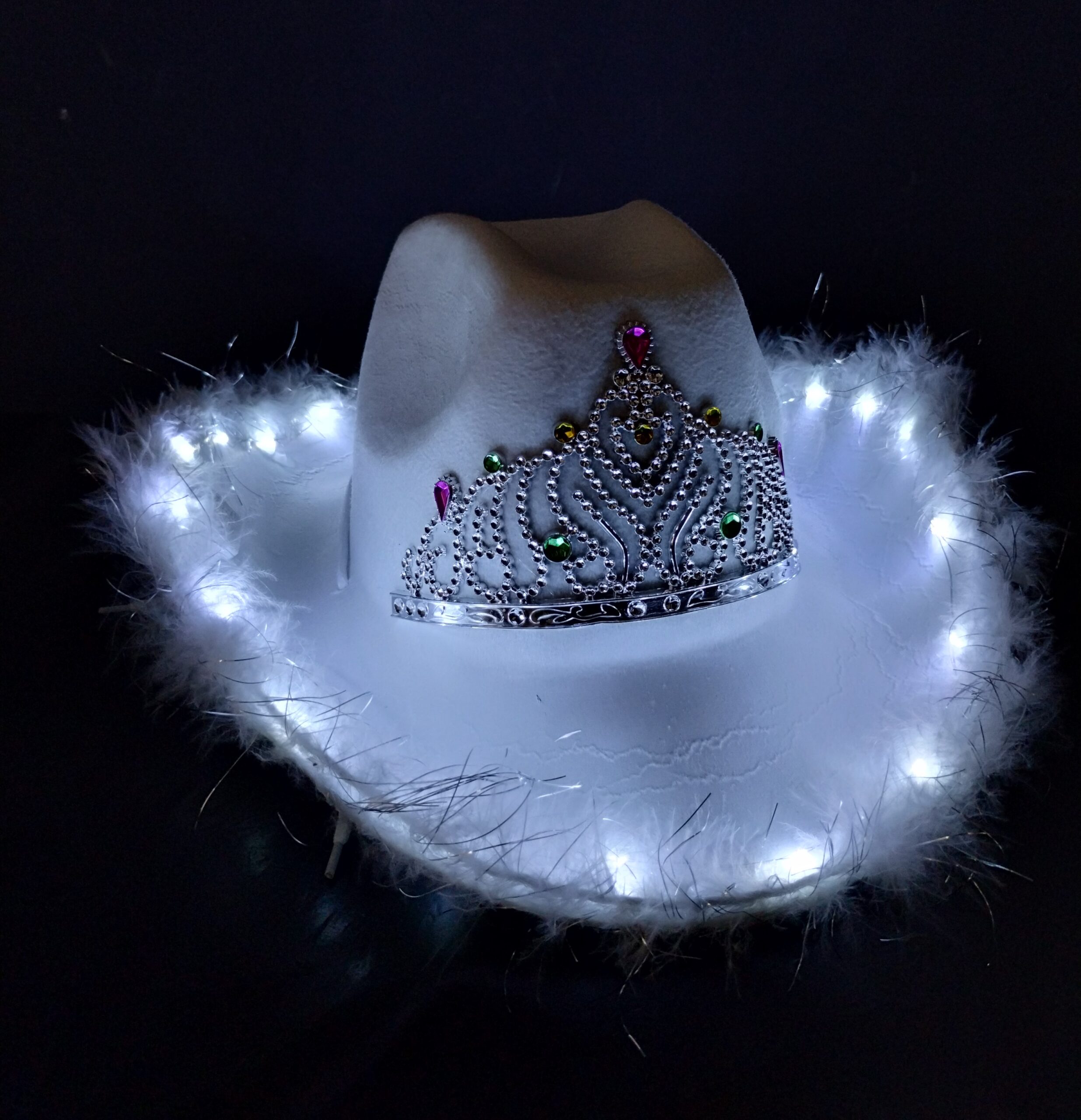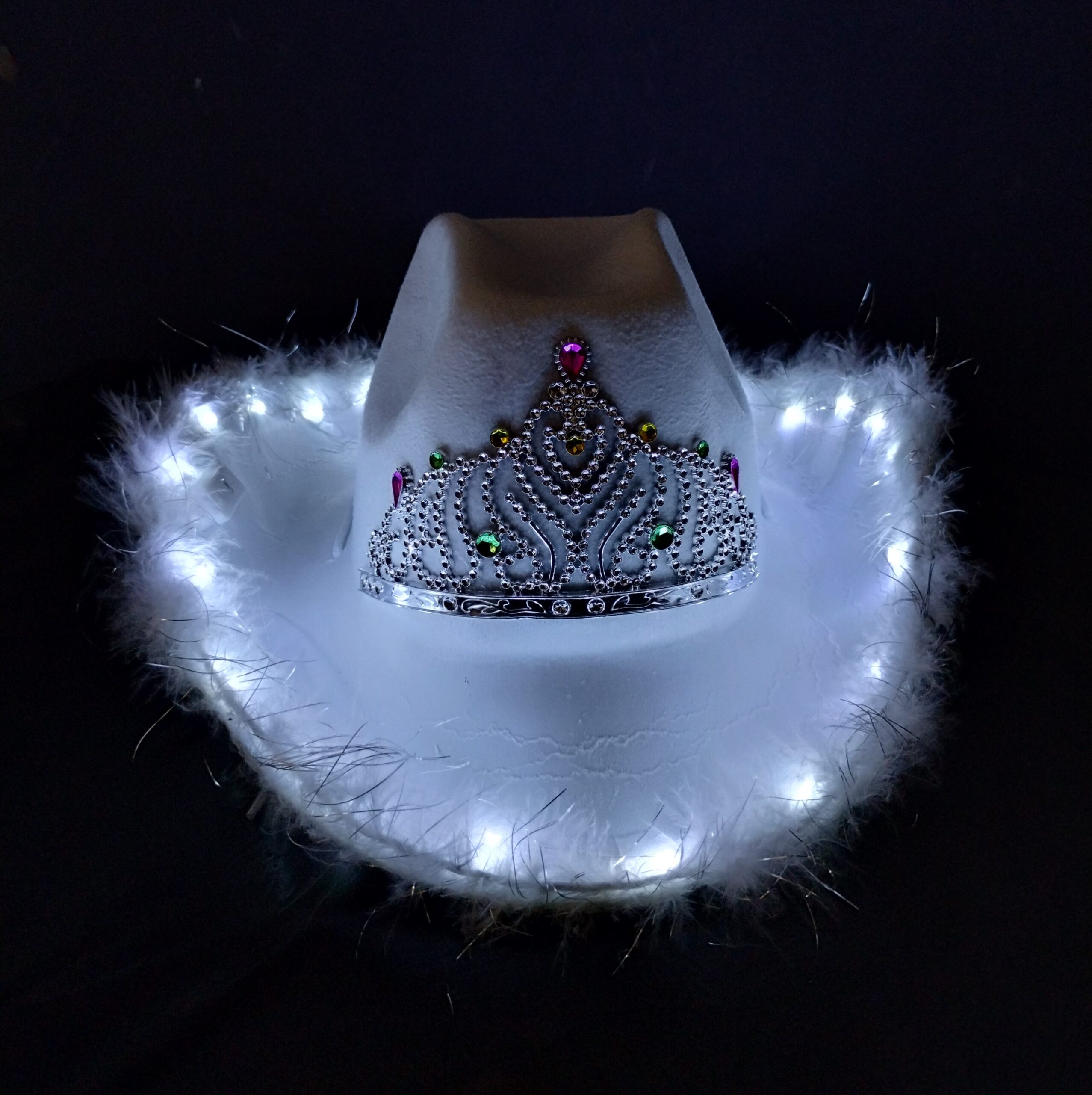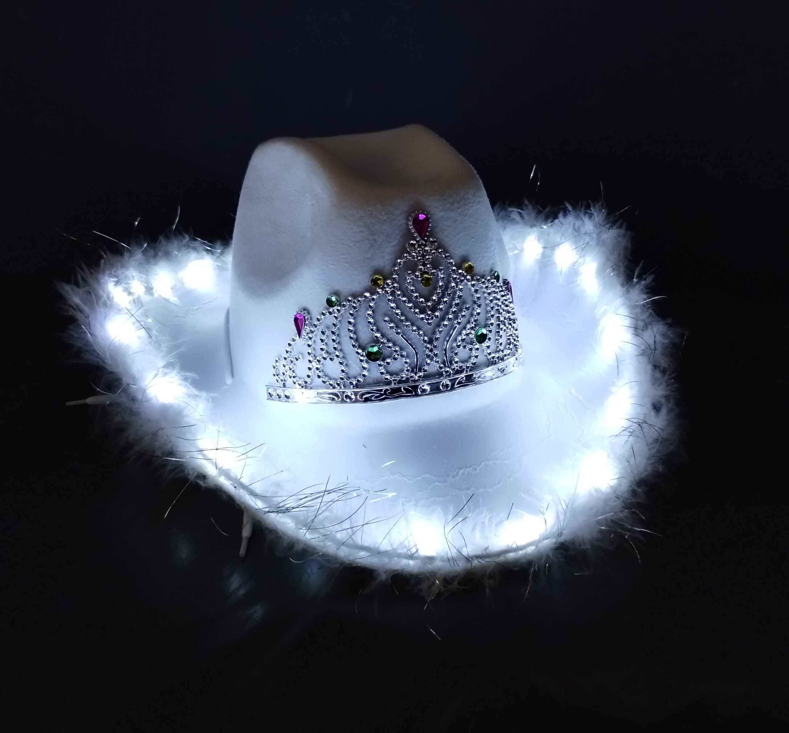🤠 Sombrero Cowgirl Blanco con plumitas LED