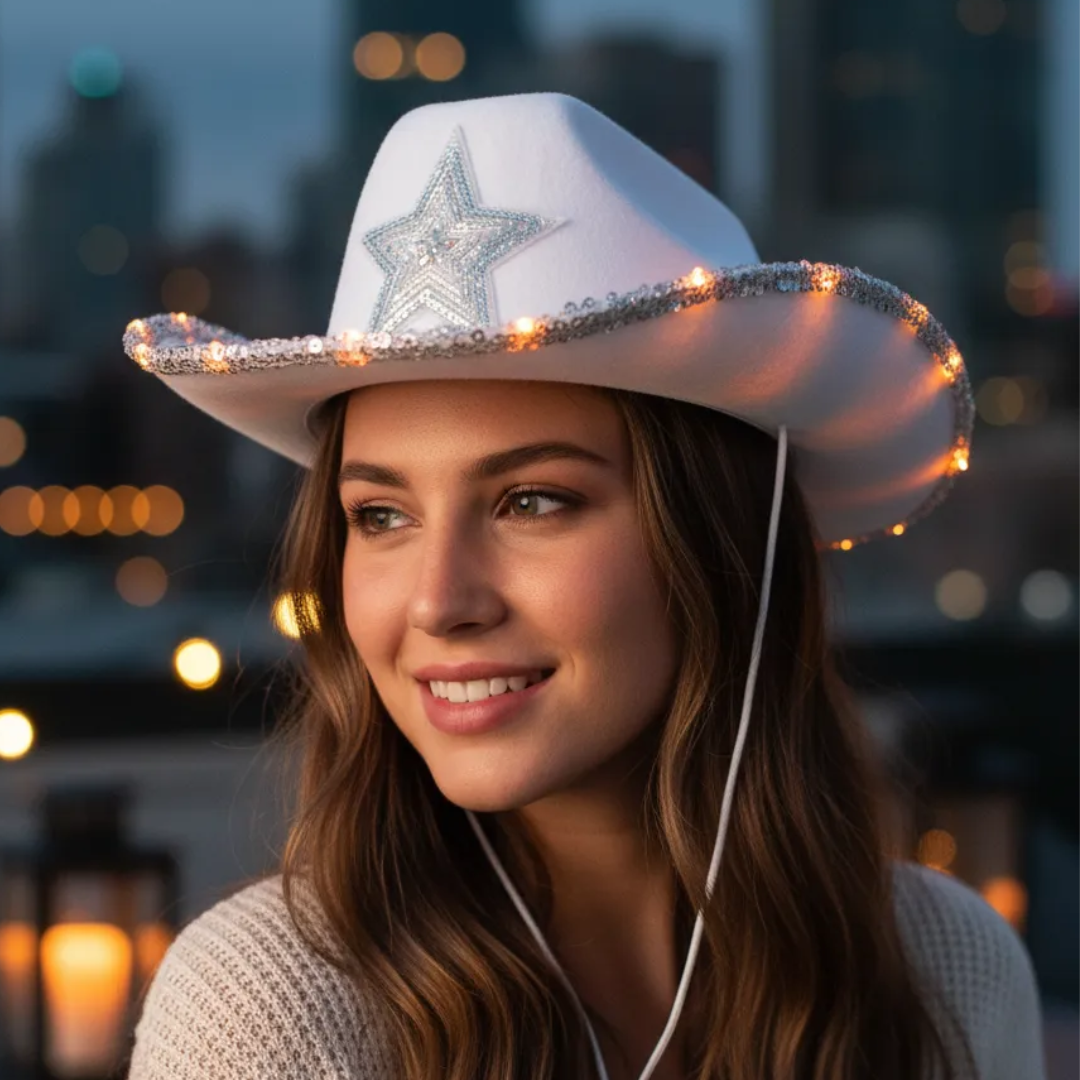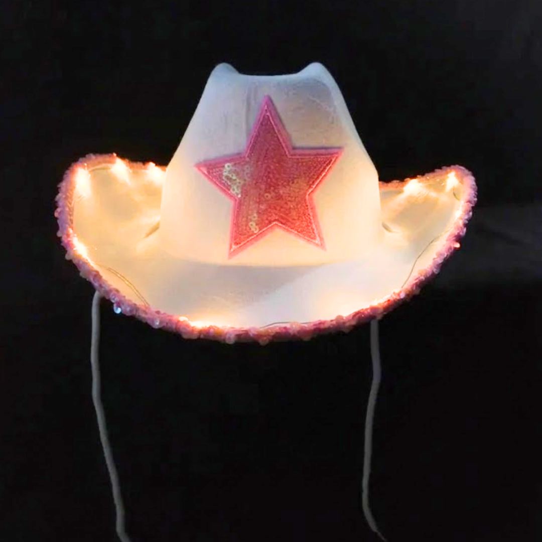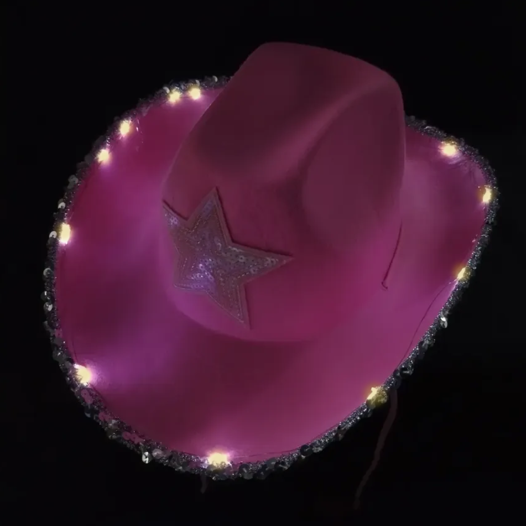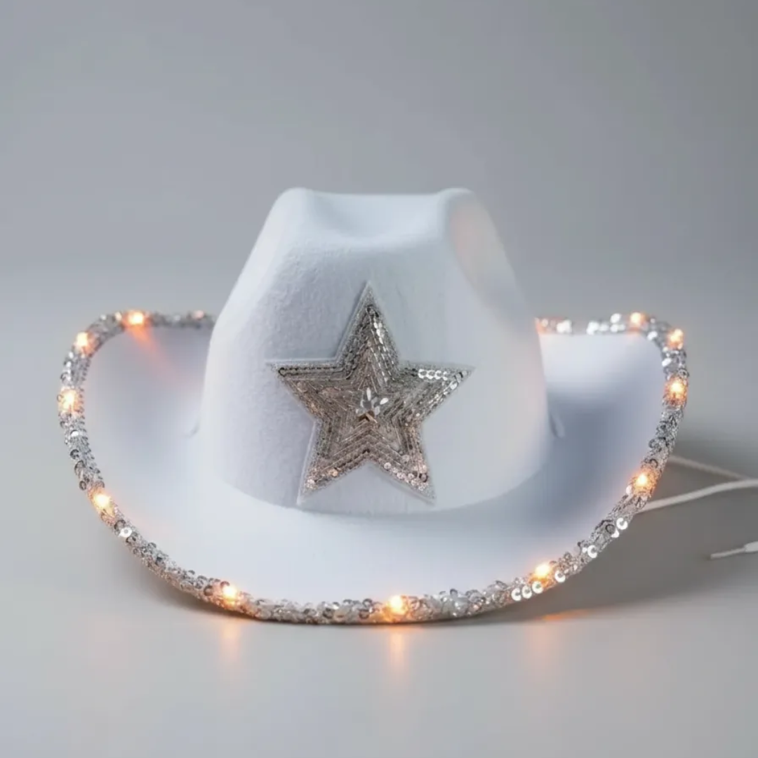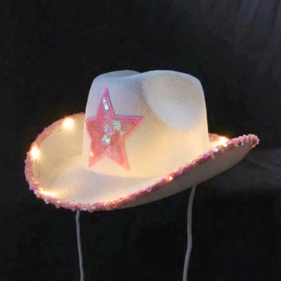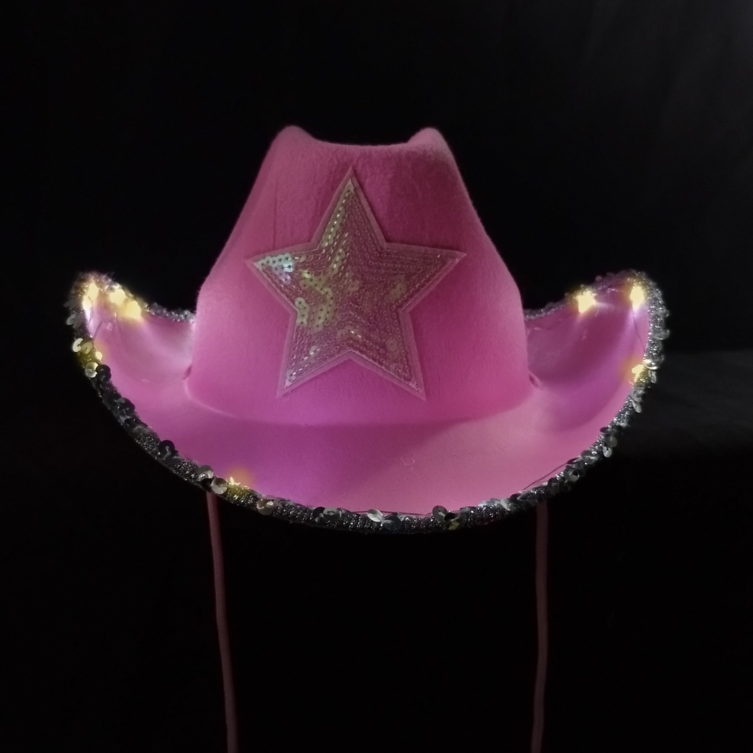 Este sombrero estilo vaquero con estrella de lentejuelas luminoso es el complemento ideal para un look divertido y canchero en tu fiesta.