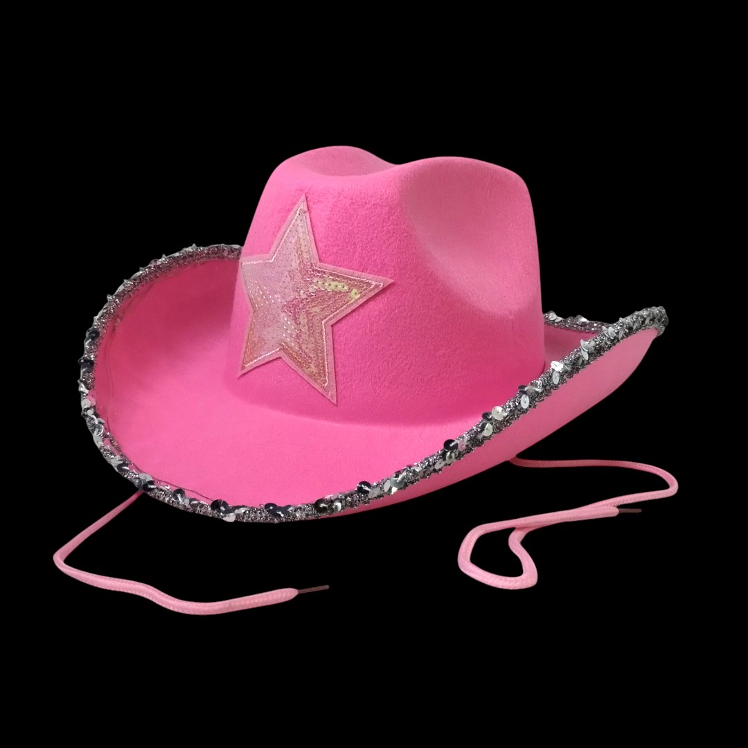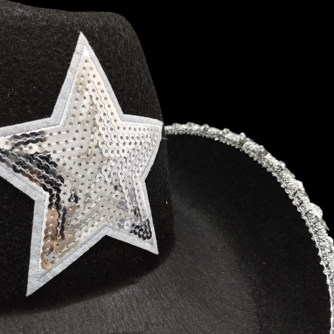Este sombrero estilo vaquero con estrella de lentejuelas. es el complemento ideal para un look divertido y canchero en tu fiesta.
