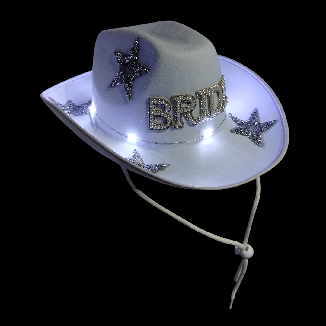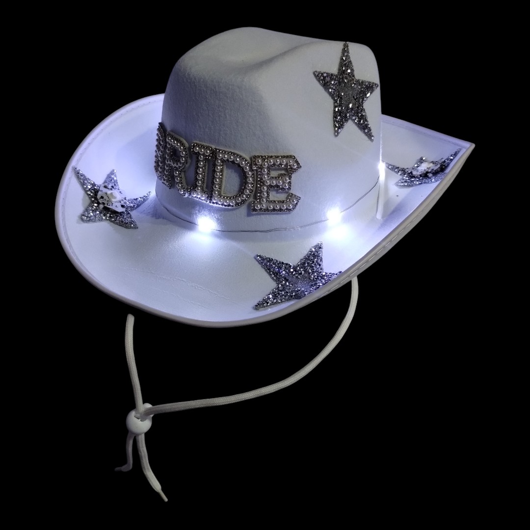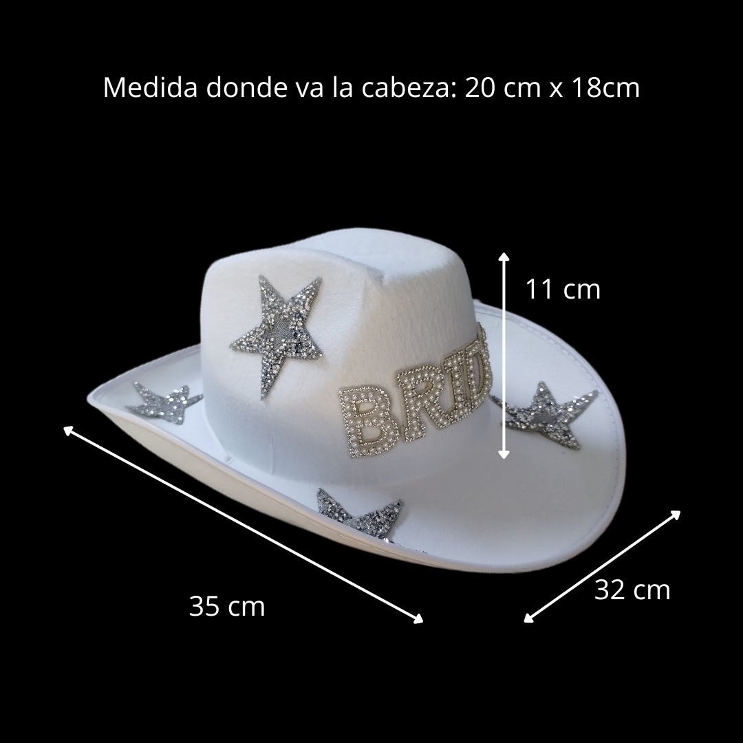 1 Sombrero Blanco estilo vaquero con la palabra BRIDE en letras plateadas con perlas y strass, calidad premium