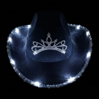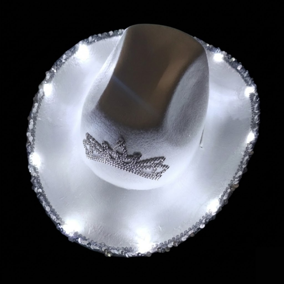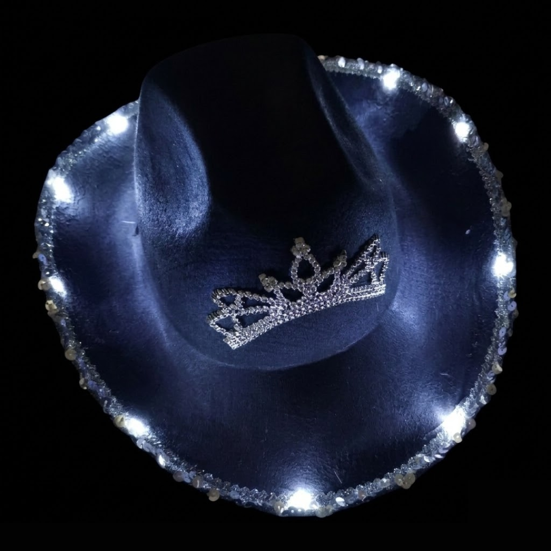 👑✨ Sombrero Cowgirl LED con Brillos y Corona Plateada