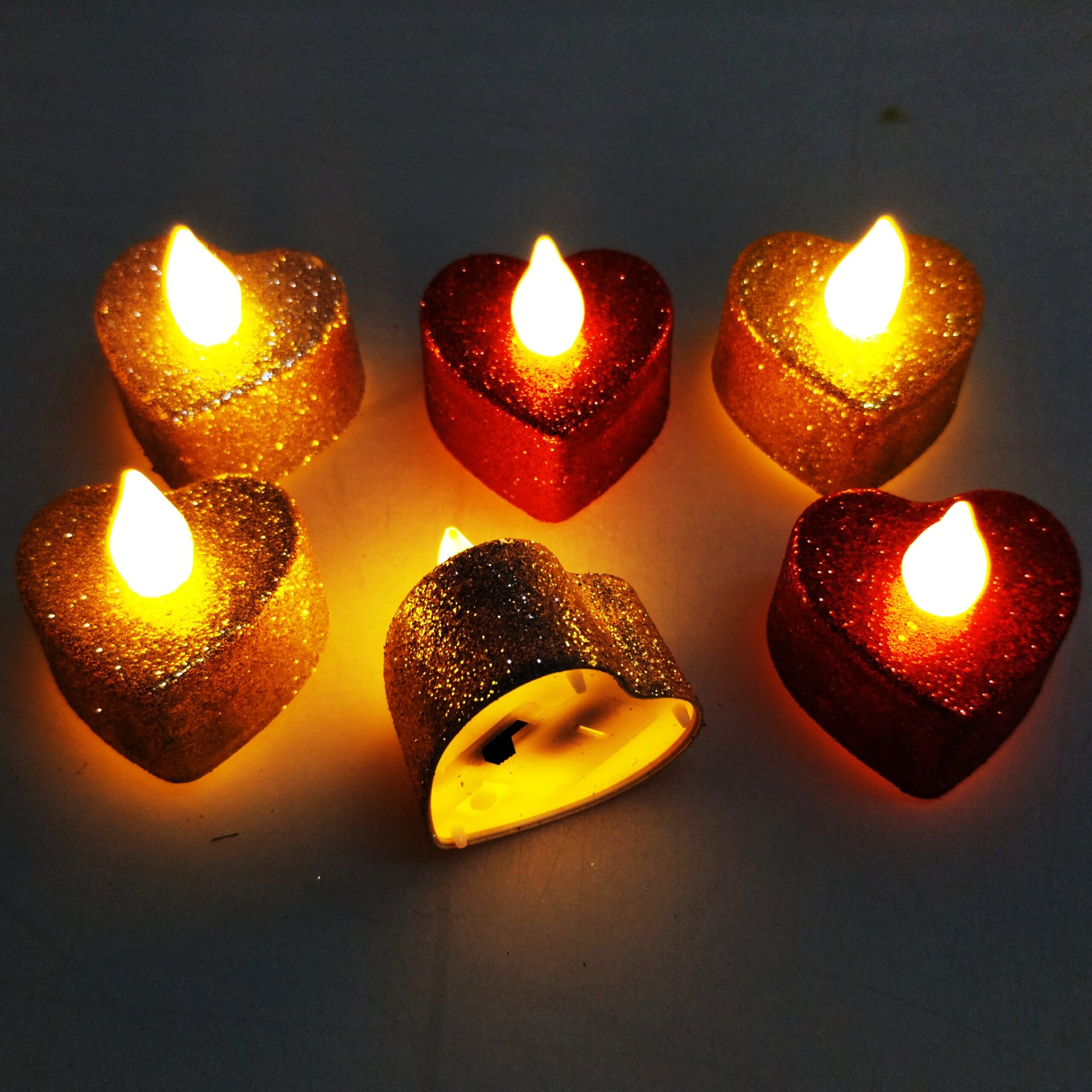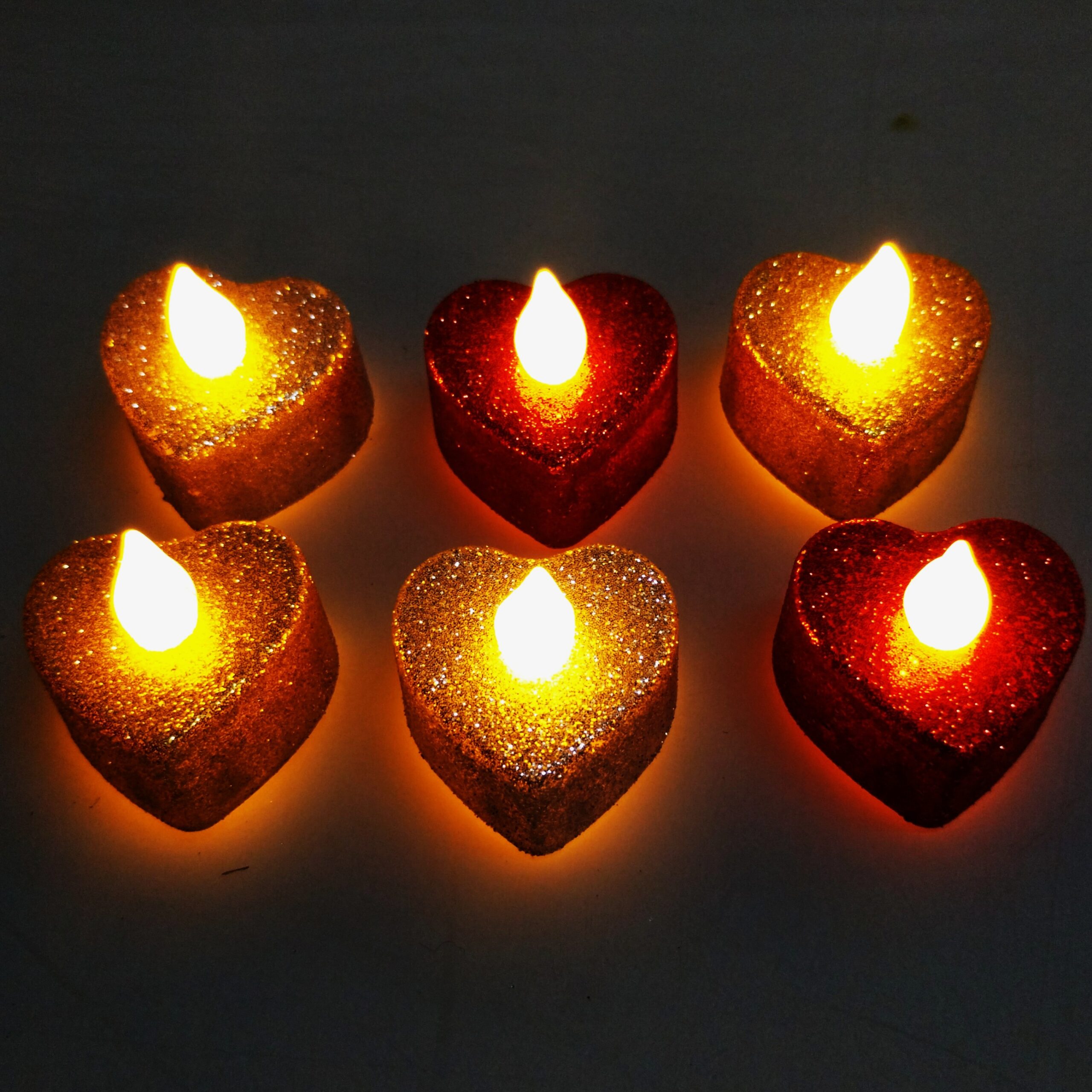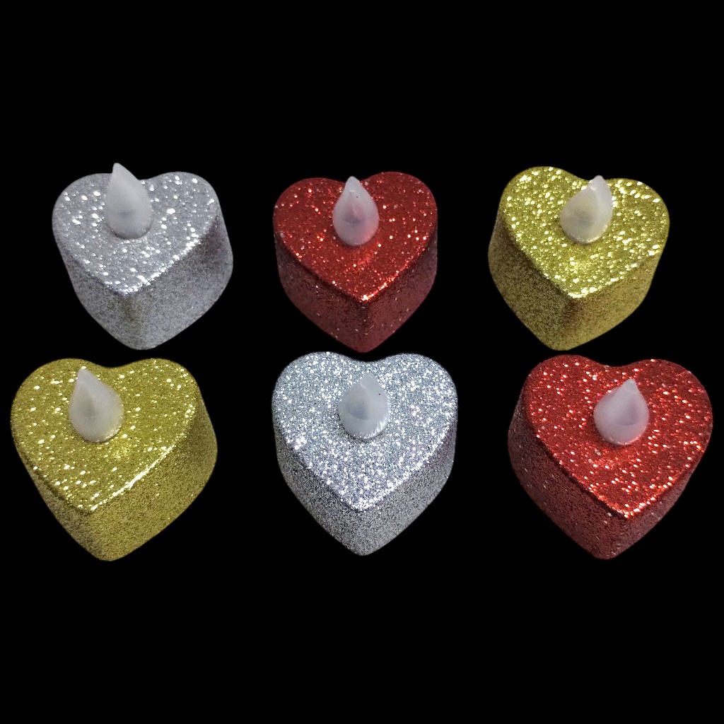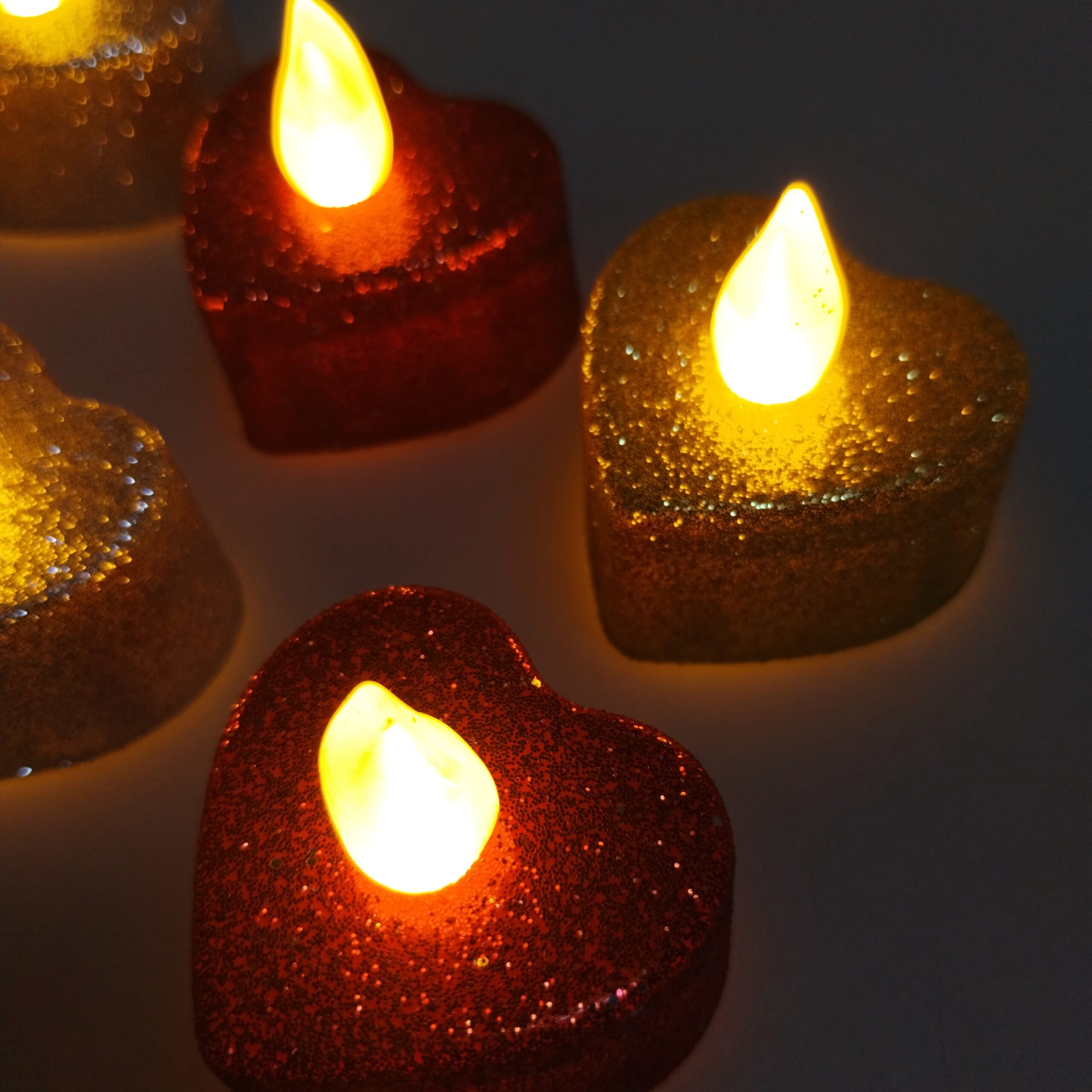 Velitas LED con diseño de corazón recubiertas en glitter (gibre) que aporta un brillo extra y un efecto súper llamativo. Emiten una luz blanca cálida que recrea el efecto de una vela real, ideales para ambientaciones románticas y decoraciones especiales.