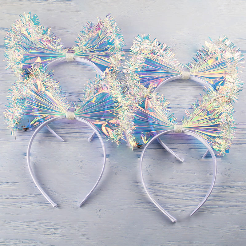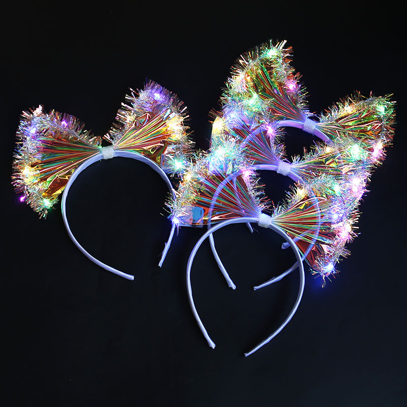 Vincha súper llamativa con moño de acabado tornasolado/iridiscente que refleja la luz en múltiples colores. Su diseño se destaca por el borde con flequitos metalizados y su iluminación LED multicolor, ideal para fiestas y eventos nocturnos.