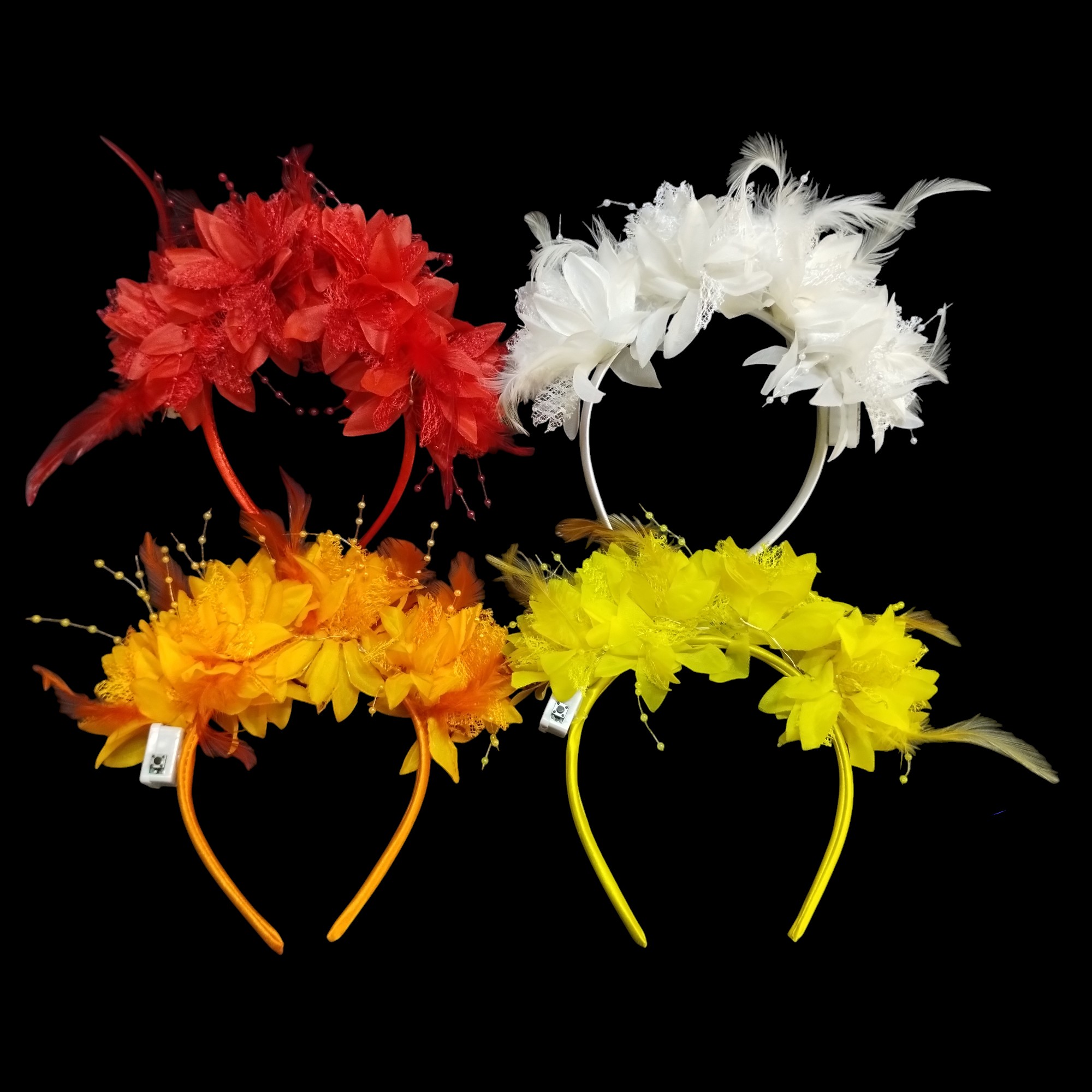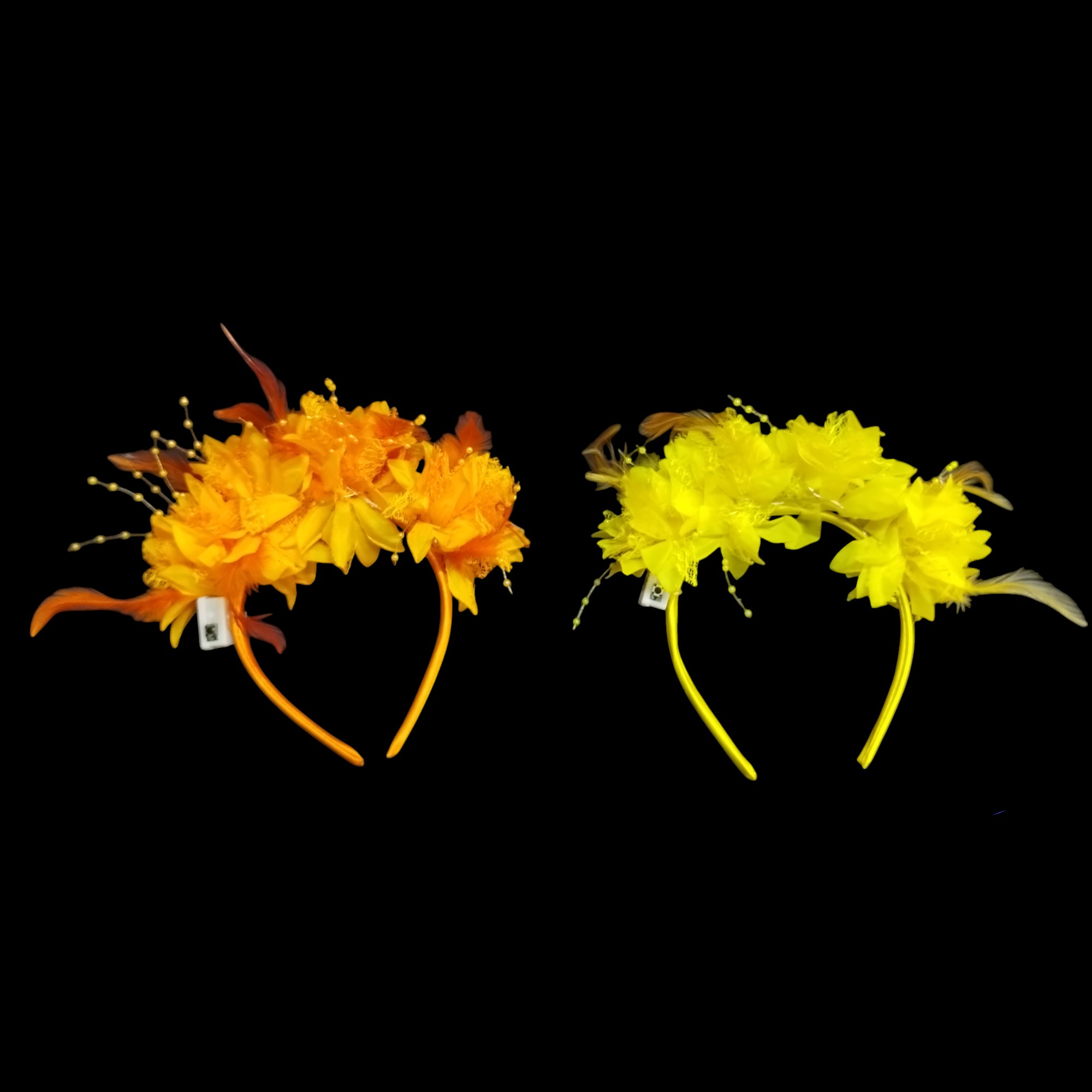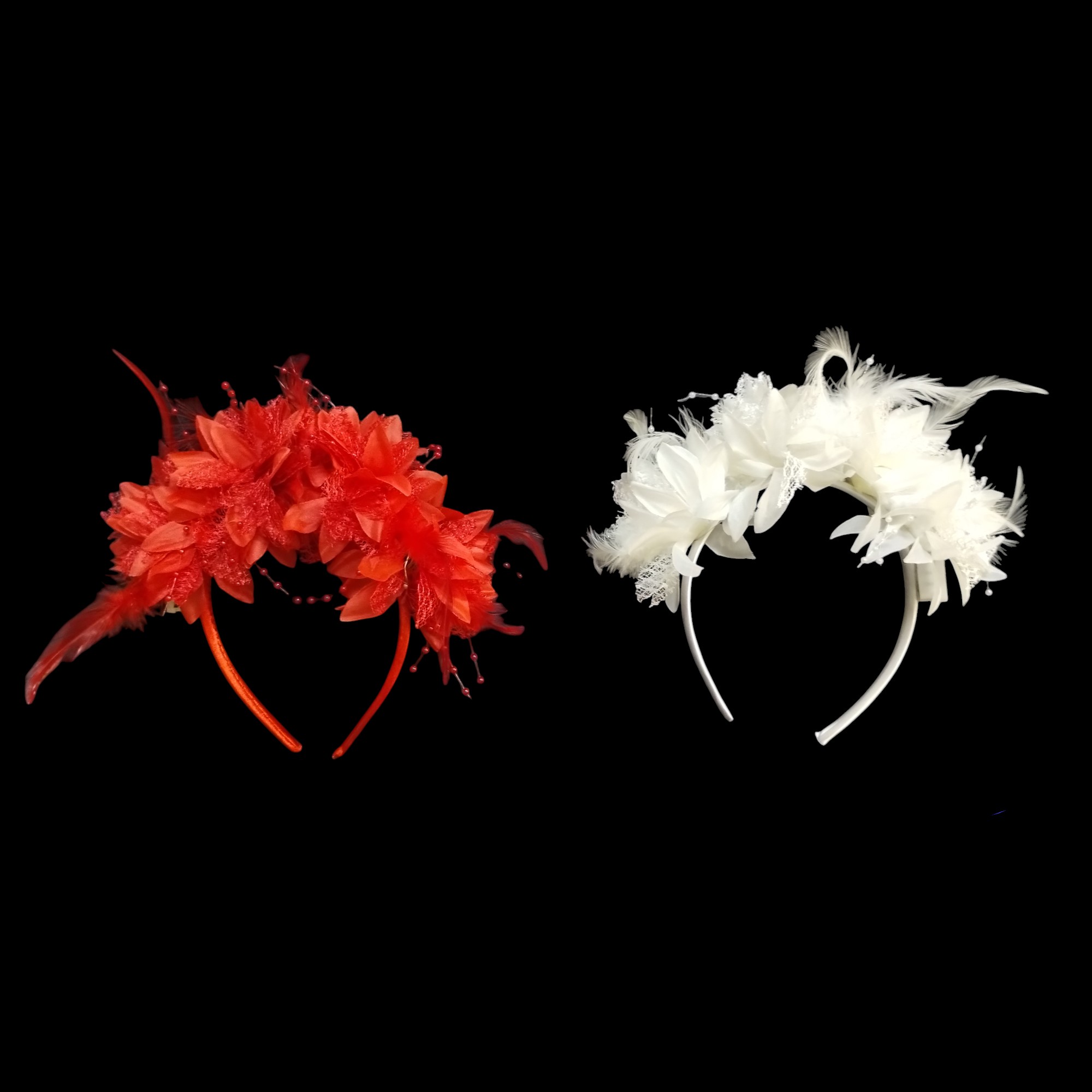 Diseño Ornamental Exclusivo: Cada vincha cuenta con una composición de flores de tela premium, acentuadas con plumas finas y detalles de lluvia de perlitas que aportan movimiento y sofisticación.